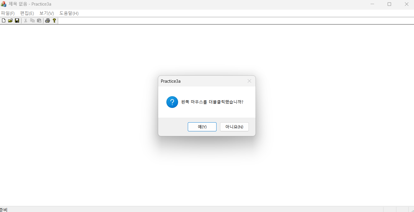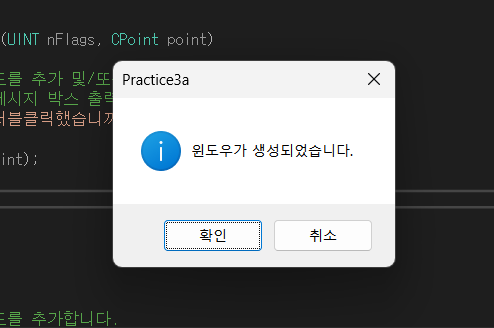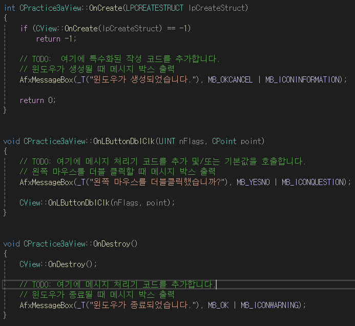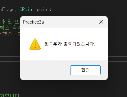 - 여기서 기본 클래스의 이름을 같이 적어주는 것은 만약 메시지가 CPractice3aView 클래스의 메시지 맵에서 일치하는 메시지 핸들러 함수를 찾지 못하면 기저 클래스인 CView 클래스의 메시지 맵에서 메시지 핸들러 함수를 찾게 됨