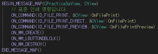 - 첫 번째 인자인 CPractice3aView 클래스는 메시지 맵이 속하는 클래스 이름이고, 두 번째 인자인 CView 클래스는 CPractice3aView 클래스의 기본 클래스임