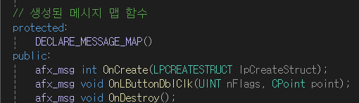 - 메시지 맵은 BEGIN_MESSAGE_MAP()으로 시작해서 END_MESSAGE_MAP()으로 끝남