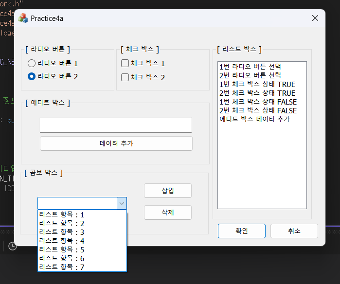 문자열을 입력하고 편집할 수 있도록 해주는 컨트롤로 주로 사용자에게 문자열을 입력받을 때 사용된다.(3) Group Box서로 연관된 컨트롤들을 시각적으로 그룹을 지어 다른 컨트롤과 구분하는 용도로 사용한다.(4) Button Control마우스로 클릭하여 어떤 동작을 수행하는 용도로 사용한다.(5) Check BoxButton Control의 일종이며 마우스로 클릭하면 체크 표시가 on/off 된다.(6) Radio ButtonButton Control의 일종이며 마우스로 클릭하면 라디오 표시가 on/off 된다. (7) List Box사용자가 선택할 수 있는 항목들을 여러 개 나열해 두고 선택할 수 있도록 해주는 컨트롤이다. 선택해야 할 대상을 키보드로 직접 입력해 주어야 하는 전통적인 방법보다 선택 대상을 보여주고 마우스로 간단히 선택할 수 있도록 하는 더욱 편리한 방법을 제공해 준다.(8) Combo BoxList Box의 단점을 해결한 것이 Combo Box이며 Edit Control과 List Box를 합쳐 놓은 모양이다. 기존의 항목을 선택할 때는 아래쪽의 List Box에서 선택하고 직접 입력해야 할 항목은 Edit Control에서 입력할 수 있으며 Combo Box는 필요할 때만 열어서 사용하고 평소에는 닫아 두기 때문에 화면 면적도 넓게 차지하지 않는다.