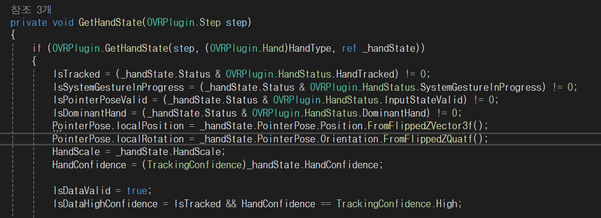 OVRPlugin과 OVRCommon에는 각각 HandState와 FromFlippedZVector3f() 가 명시되어 있다.